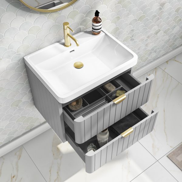 600mm Grey Wall Hung Vanity Unit with Basin and Brass Handles – Empire