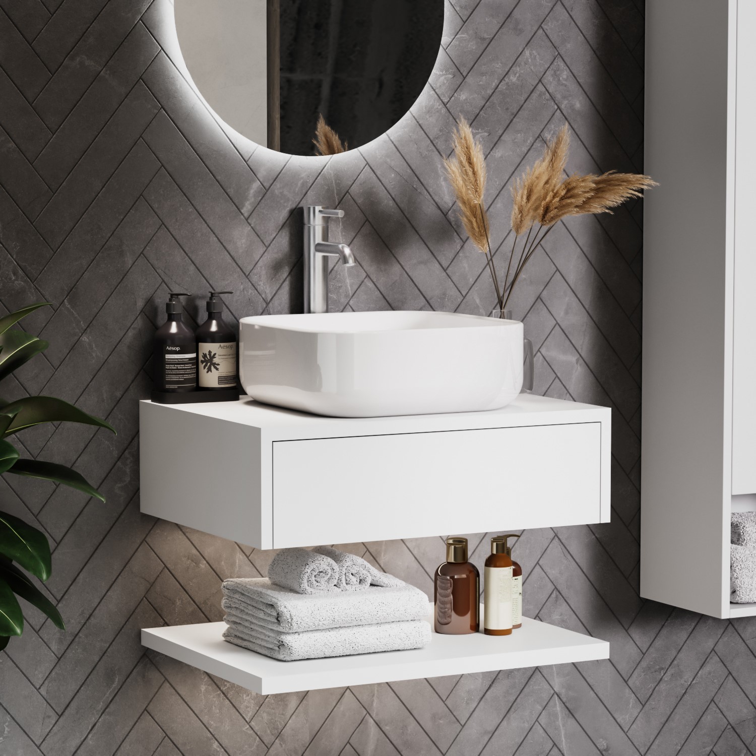 600mm White Wall Hung Countertop Vanity Unit with White Square Basin and Shelves – Lugo