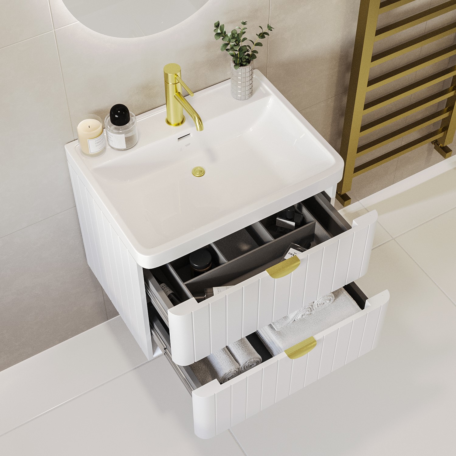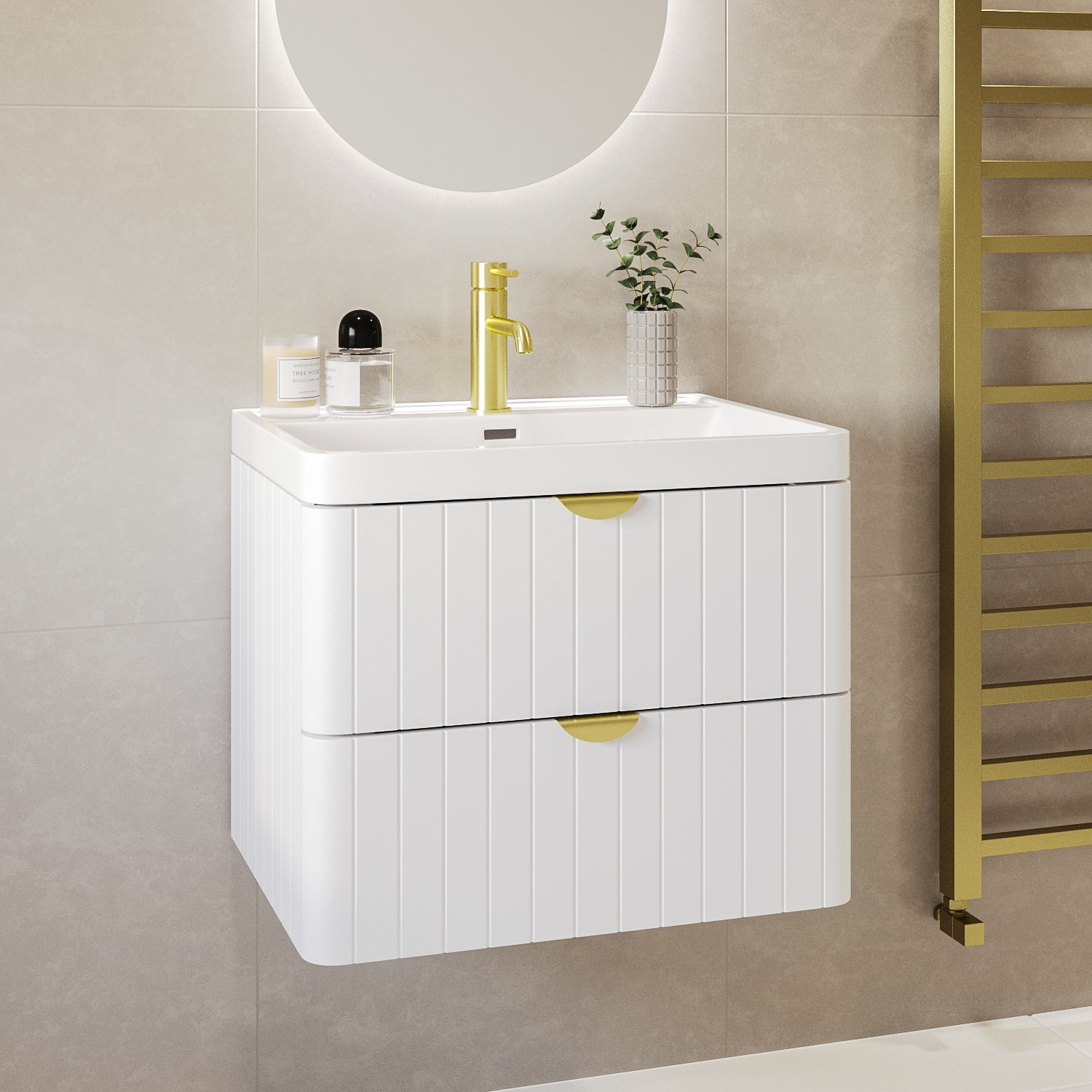600mm White Wall Hung Vanity Unit with Basin and Brass Handles – Empire