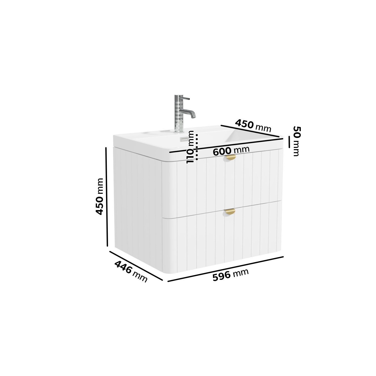 Dimensions: H455 x W600 x D450 mm (Please note, the width of this unit measures 600mm due to an overhanging basin lip. However, the main footprint is 596mm.)