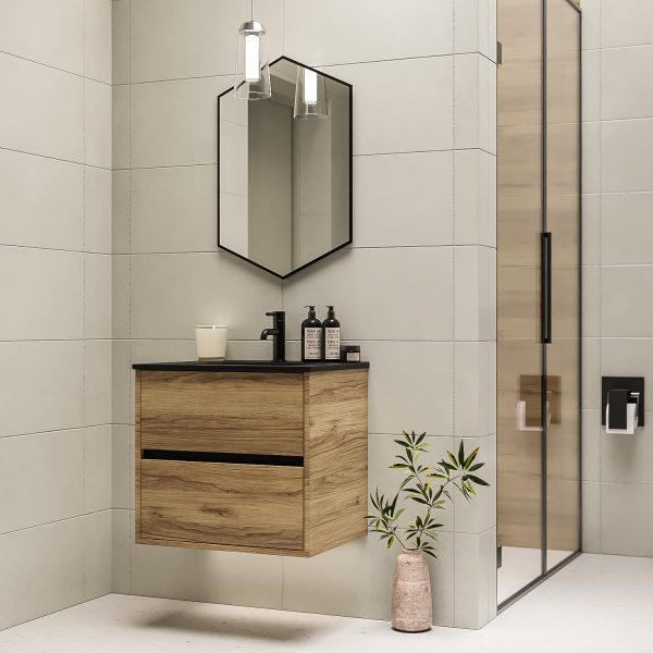 600mm Wood Effect Wall Hung Vanity Unit with Matt Black Basin – Roxbi