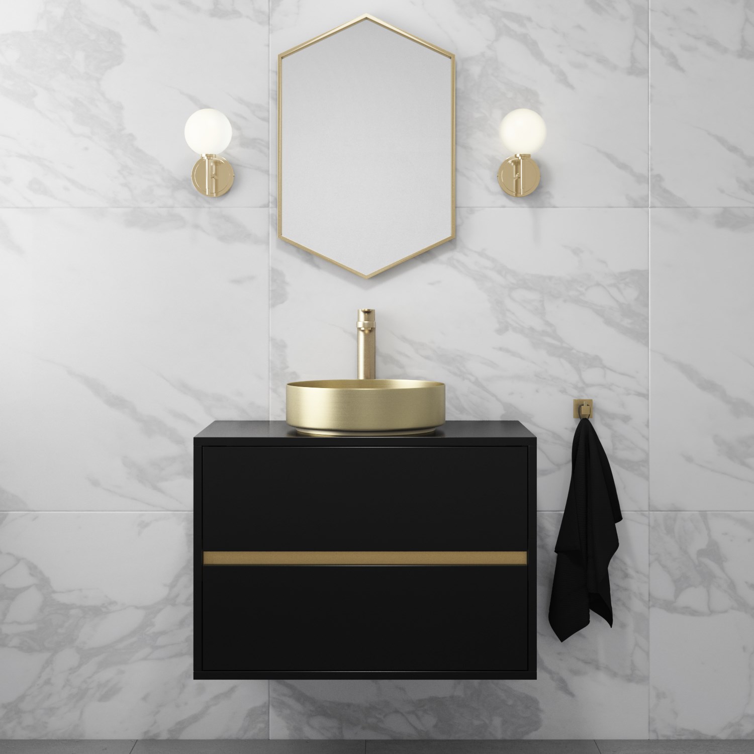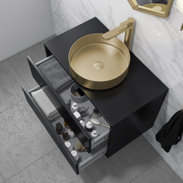 Get the look of a high-end boutique hotel with this stylish countertop vanity basin unit. With a minimalist handless opening and matt black finish, it’ll add elegance to any bathroom. A high-quality stainless-steel, round countertop basin in brushed brass with matching waste is included, making a striking contrast. No assembly is required, just secure the basin, install your chosen tap and get to using it right away.