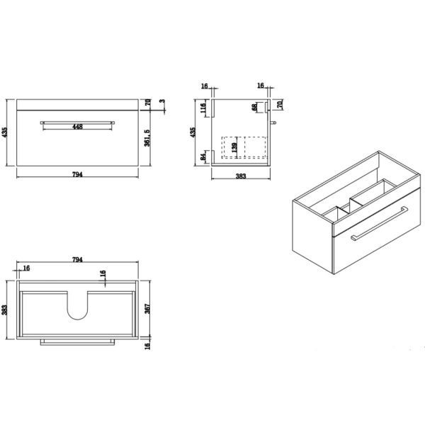 - Dimensions: H 435 x W 800 x D 395 mm – Please note, the width of this basin measures 810mm due to an overhanging lip. However, the main footprint is 800mm.