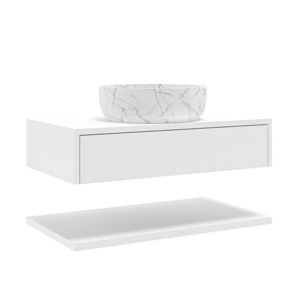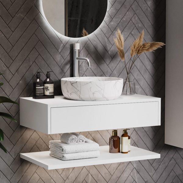 800mm White Wall Hung Countertop Vanity Unit with White Marble Effect Basin and Shelves – Lugo