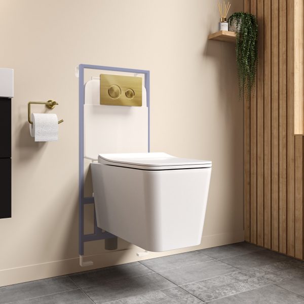 White Square Wall Hung Rimless Toilet with Soft Close Seat Cistern Frame and Brushed Brass Flush – Augusta